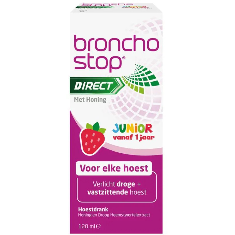 Heeft je kind last van een vervelende hoest? Bronchostop DIRECT Junior met honing zorgt voor directe verlichting van elke hoest. De hoestdrank kalmeert de hoestreflex bij vastzittende hoest, kriebel- en prikkelhoest. Bronchostop DIRECT Junior werkt als een balsem die het ontstoken slijmvlies in de keel bedekt en daardoor verzacht.