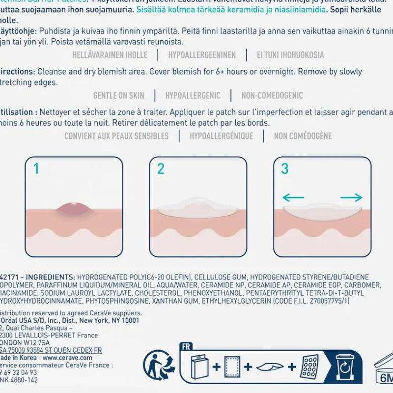Hydrocolloïde technologie: absorbeert overtollige talg. 3 essentiële ceramiden: helpen die de huidbarrière te herstellen. Niacinamide (vitamine B3): staat bekend om zijn kalmerende werking.