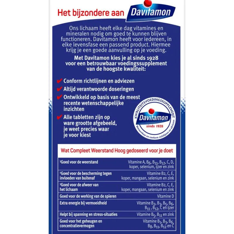 Davitamon Compleet Weerstand Forte Kauwtabletten zijn speciaal ontwikkeld voor volwassenen en hebben een lekkere bosvruchtensmaak. De kauwvitamines bevatten een extra hoge dosering van belangrijke vitamines (min. 200% van de ADH) en mineralen (min. 150% van de ADH) en is daarom: