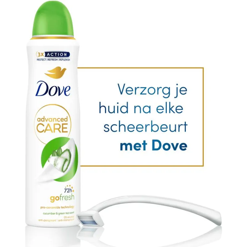Dove Advanced Care Go Fresh Cucumber & Green Tea Anti-Transpirant Deodorant Spray met de ontspannende geur van groene thee beschermt tegen zweet én is lief voor je oksels. Het Advanced Care assortiment van Dove met de verbeterde formule met Pro-Ceramide serum maakt deel uit van de meest verzorgende lijn van Dove. De spray biedt onmiddellijke verlichting na het scheren, helpt de okselhuid te herstellen en beschermt tot 72 uur tegen zweet en lichaamsgeur. Bovendien bevat deze milde formule 0% alcohol. De hele dag een fris en verzorgd gevoel – wat de dag je ook brengt!