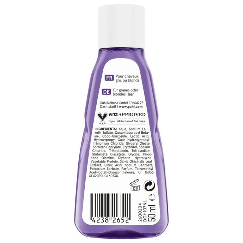 Guhl Zilverglans & Verzorging mini shampoo, voor grijs of blond haar, helpt ongewenste gele gloed te verminderen* en versterkt het haar van de aanzet tot in de punten. De zilvershampoo verzorgt het haar, biedt voelbare souplesse en geeft een levendige, stralende glans – zonder te verzwaren. Ook geschikt voor blond haar.
