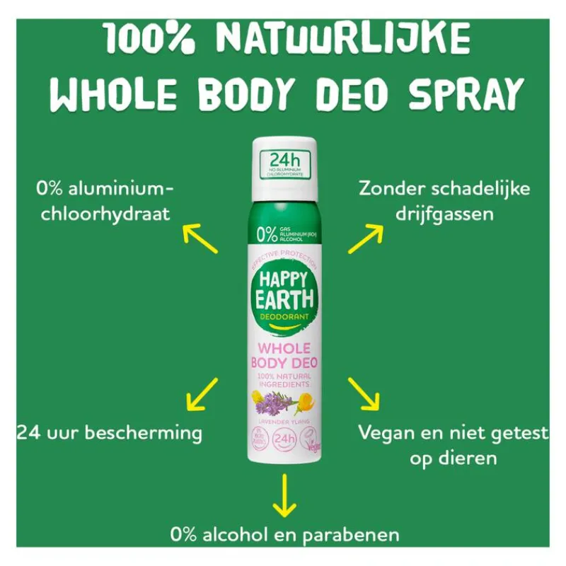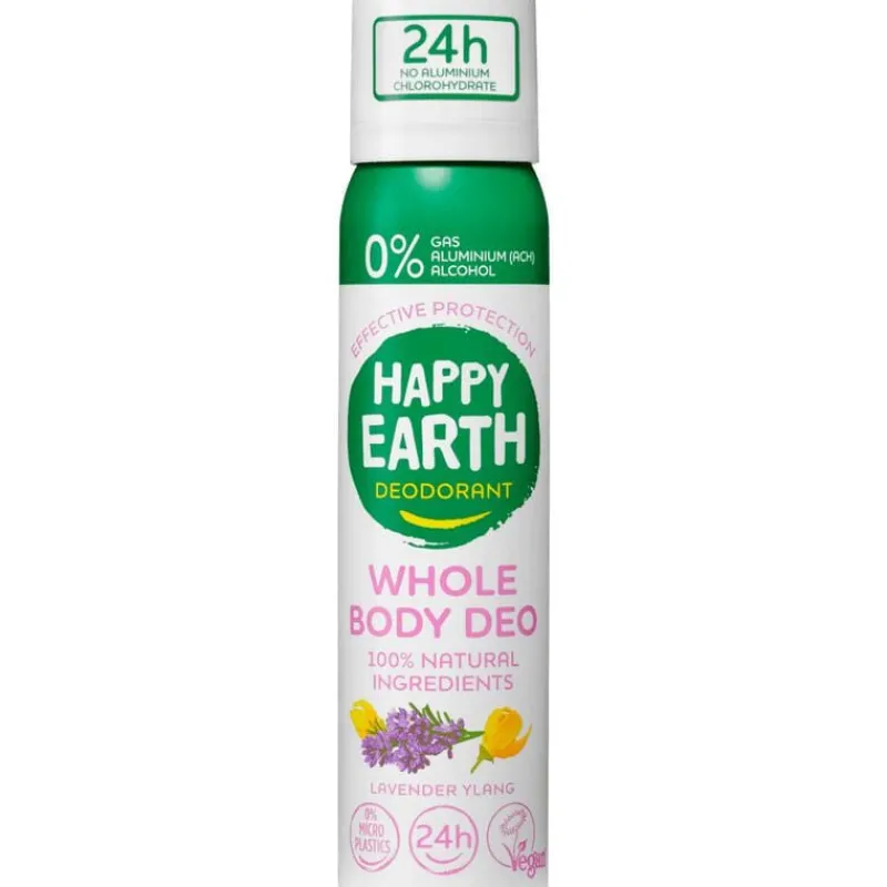 Happy Earth Whole Body Deo Spray Lavender Ylang is een 100% natuurlijke vegan deo spray die gemaakt is van ingrediënten waar jouw huid én de aarde blij van worden. Deze deodorant is vrij van aluminium-chloorhydraat en bevat geen alcohol, parabenen of andere nare toevoegingen. Deze deodorant is speciaal ontwikkeld voor je hele lichaam, van oksels tot borst, dijen of waar je maar extra frisheid wilt.