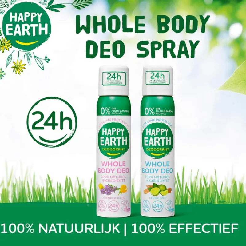 Dankzij een innovatieve technologie zijn de Happy Earth 100% Natuurlijke Whole Body Deo Sprays niet alleen 100% natuurlijk en 100% effectief, ze zijn bovendien volledig vrij van schadelijke drijfgassen die slecht zijn voor de aarde en voor je huid. Zo blijf je de hele dag op een natuurlijke manier fris!