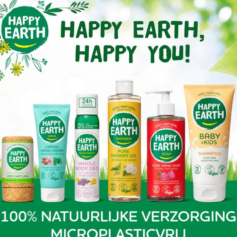 Happy Earth biedt vrolijkheid en optimisme met de beste producten voor jou én de aarde. Het ruime assortiment bestaat uit deodorant, douchegel, handzeep, babyverzorging, bars en lichaamsverzorging. Bij Happy Earth gebruiken ze alleen 100% natuurlijke ingrediënten. De producten zijn vegan, microplasticvrij en vrij van nare toevoegingen. Daar wordt je huid extra blij van! Daarnaast zijn de verpakkingen zo duurzaam mogelijk: volledig zero waste, plasticvrij, tubes van suikerriet of 100% gerecycled plastic. En niet te vergeten: ze produceren in Nederland met groene energie. Happy Earth, happy you!