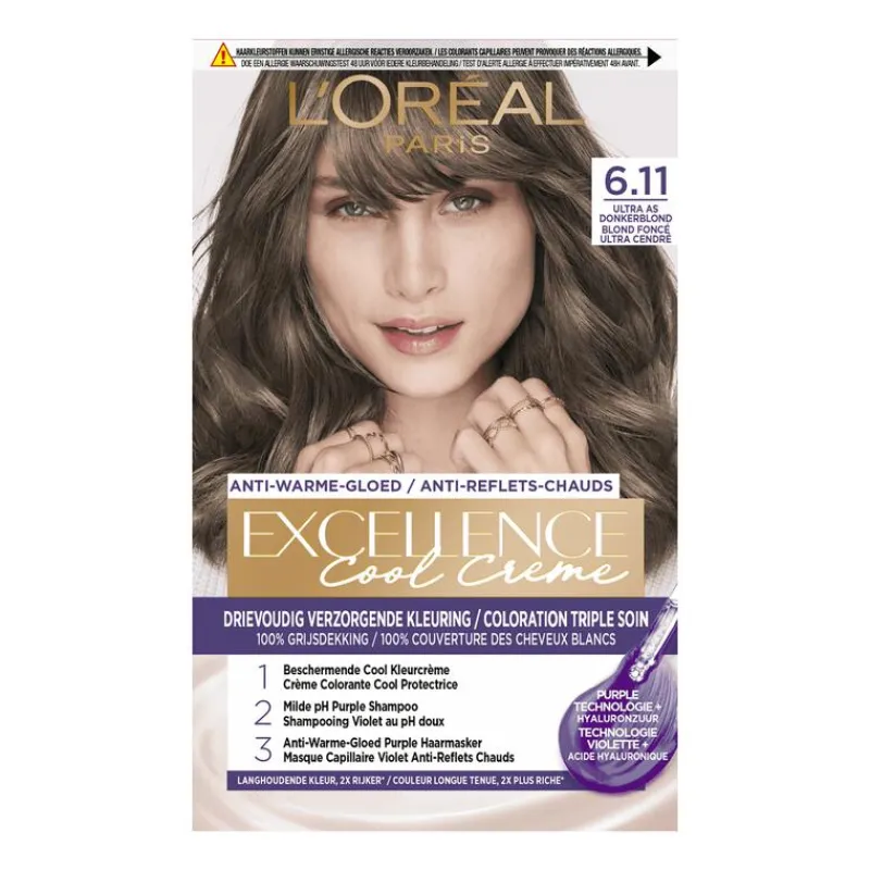 L’Oréal Paris Excellence Cool Crème is een permanente haarkleuring die ideaal is voor het dekken van grijs haar. De haarkleuring biedt tot 100% grijsdekking en een koel kleurresultaat. Wil jij je haar verven in een koele kleur? De crèmekleuring beschermt, de pH purple shampoo is zacht voor de hoofdhuid en verzorgt en het haarmasker voedt en beschermt het haar tegen gele en oranje ondertonen. De crèmekleuring, verrijkt met pro-keratine, helpt bij het versterken van het haar. De formule zorgt daarnaast voor bescherming van het haar tijdens het kleuren en een rijke, langhoudende koele kleur. Bij de kleuring zit een pH purple shampoo. Deze is zacht voor de hoofdhuid. Je gebruikt de shampoo na het kleuren om overtollige crèmekleuring uit het haar te spoelen. De shampoo onthult de glans van het haar en maakt het gladder. Het anti gele gloed haarmasker is de laatste stap van de kleurbehandeling. In het haarmasker zitten paarse pigmenten die de gele en oranje ondertonen in het haar neutraliseren, zodat je de gewenste koele haarkleur behoudt. Je kunt het haarmasker na het kleuren meerdere malen gebruiken. Zo blijft het haar glanzend en soepel en het kleurresultaat langer koel.