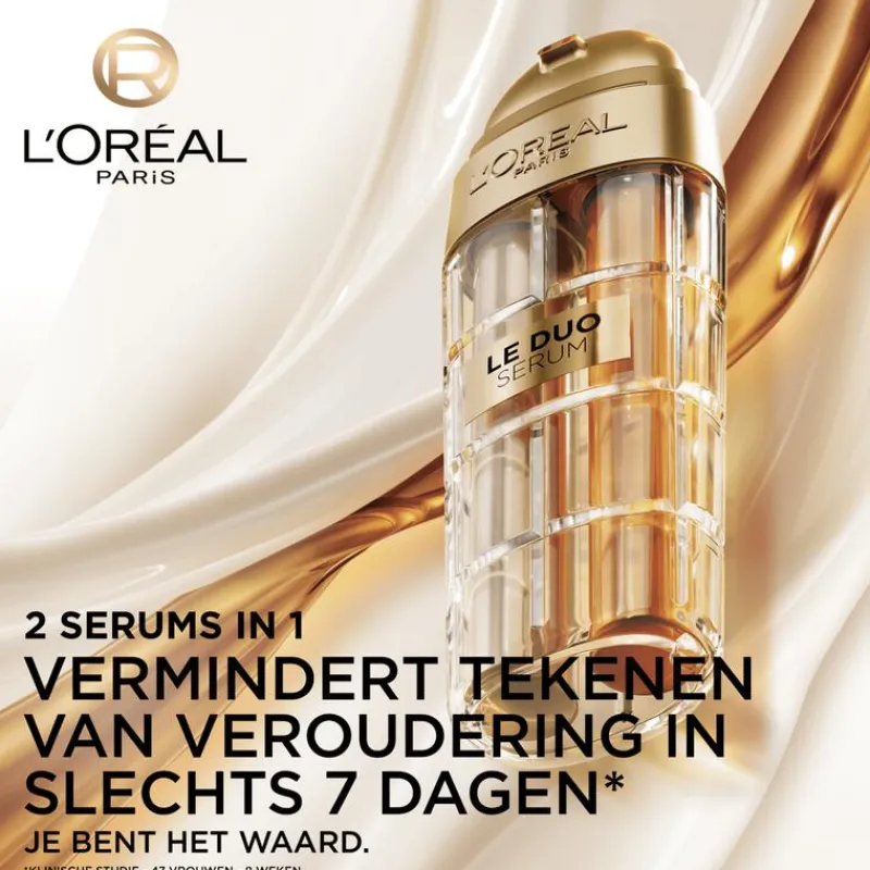 Ontdek het L’Oréal Paris Age Perfect Serum Le Duo, een baanbrekende innovatie van de L’Oréal laberatoria. Verminder zichtbaar tot 5 jaar aan rimpels* met het nieuwe Age Perfect Le Duo Serum. Naarmate de huid ouder wordt, heeft ze behoefte aan meer verzorging. Ervaar de kracht van 2 serums in 1, twee krachtige serums werken samen om de tekenen van veroudering tegen te gaan*. Beleef de luxueuze formule met aan de ene kant een Collageen Booster Peptiden serum om je huidstructuur te verbeteren voor een stevigere huid en een vermindering in rimpels; en aan de andere kant Vitamine B3 en C**, deze twee krachtige vitamines laten de huid weer stralen en egaliseren de teint. Dermatologisch getest en geschikt voor alle huidtypes, voor een stralende en jonger uitziende huid. Bewezen resultaten***: Direct: De huid voelt gladder en intens gevoed aan. Na 7 dagen: De huid ziet er jonger, stralender en voller uit. Na 4 weken: De huid is steviger en egaler. Rimpels zijn verminderd. Dermatologisch getest – Geschikt voor alle huidtypes. Snelle en soepele absorptie. Luxueuze formule. Belangrijkste ingrediënten: Collageen Booster Peptiden: Geeft je huid een boost om de stevigheid te helpen herstellen en rimpels glad te strijken. Vitamines B3 & C*: Doen de uitstraling herleven en egaliseren de huidteint met twee krachtige vitamines. * Klinische studie, 47 vrouwen. Equivalentie in jaren van uiterlijke verbetering van kraaienpootjes.**Vitamine Cg is een afgeleide van vitamine C. ***Klinische studie – 47 vrouwen – 8 weken.