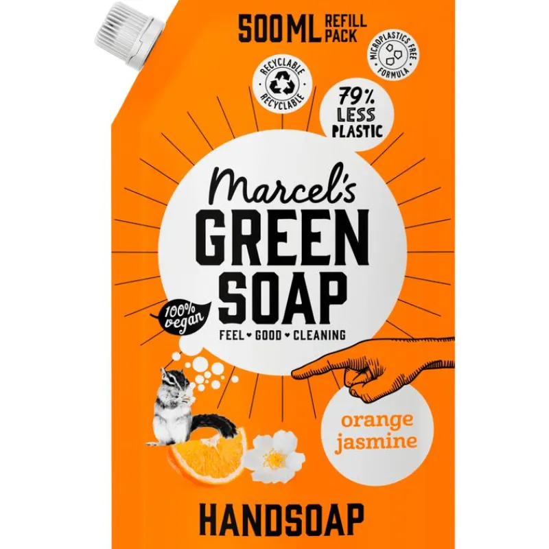 Marcel’s Green Soap handzeep Sinaasappel & Jasmijn is gemaakt van plantaardige zepen, minstens 97% biologisch afbreekbaar én verrijkt met plantaardige glycerine voor zachte handen. In tegenstelling tot reguliere handzeep, zit de duurzame handzeep van Marcel bomvol natuurlijke ingrediënten. Stoffen die schadelijk kunnen zijn voor het milieu, je huis of je lichaam zul je dan ook nooit in onze handzeep tegenkomen. Sterker nog, je kunt er lekker vaak je handen mee wassen, want de handzeep bevat plantaardige glycerine die zorgt voor een superzachte huid. En door een ecologische handzeep te gebruiken help je mee bij het schoonhouden van de planeet. Voelt een stuk beter, toch? Dát is handzeep waar je blij van wordt.