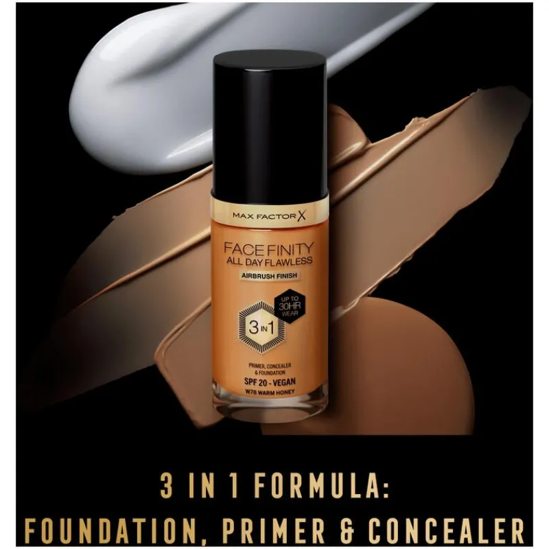 Max Factor Facefinity All Day Flawless Foundation staat garant voor een feilloze make-uplook en is nu bestand tegen alle weersomstandigheden. Deze 3-in-1 vloeibare foundation doet tegelijk ook dienst als gezichtsprimer en heeft het effect van een concealer die de hele dag mooi blijft zitten. De vederlichte, zuurstofdoorlatende vegan formule maakt poriën en roodheid minder zichtbaar en camoufleert oneffenheden. Niet alleen zorgt de formule voor een perfect egale finish, maar deze foundation is ook bestand tegen de weersomstandigheden en verrijkt met SPF20 om de huid te beschermen tegen uv A- en uv B-stralen, blauw licht en vervuiling.