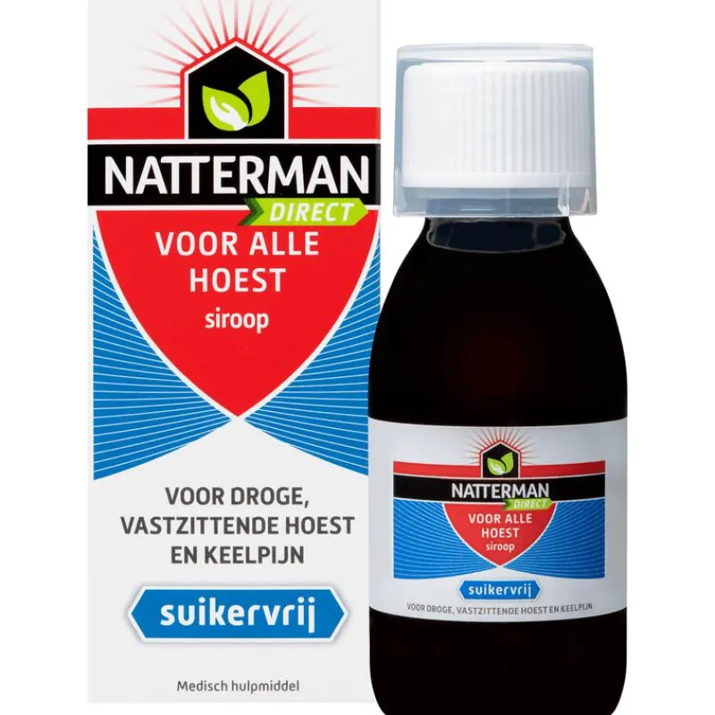 Natterman Direct Voor Alle Hoest Suikervrije siroop helpt bij de behandeling van alle soorten hoest: vastzittend, droog, irriterend, allergisch en bij keelpijn dankzij de 3-voudige werking van de polysachariden in de siroop.