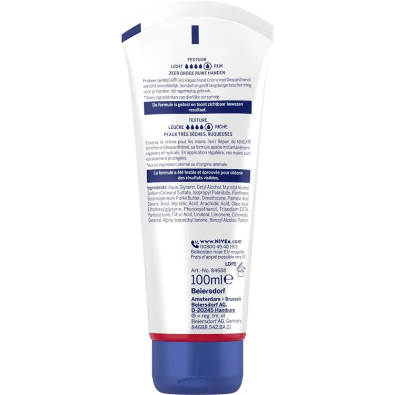 NIVEA 3-in-1 Repair Handcrème geeft je in een handomdraai 24 uur lang zachte en beschermde handen. De geconcentreerde formule met dexpanthenol herstelt onmiddellijk de zeer droge en trekkerige huid, geeft langdurige hydratatie en versterkt de huidbarrière om verlies van vocht te voorkomen. Deze NIVEA handcrème zorgt er tevens voor dat je nagelriemen minder snel scheuren, een veel voorkomende huidirritatie bij droge handen. Net als pijnlijke kloofjes in de winter. Deze ongemakken voorkom je met de handverzorging van NIVEA Repair.