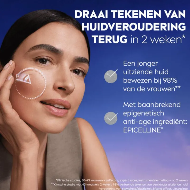Ontdek baanbrekende huidverzorging met het NIVEA Cellular Epigenetics Serum 30ml. Dankzij de gepatenteerde Age Clock Technologie en krachtige werking van EPICELLINE® draait dit serum tot wel 10 zichtbare tekenen van huidveroudering terug in 2 weken. Klinisch bewezen resultaten tonen een vermindering van rimpelvolume (-24%), een vollere huid (+47%), meer elasticiteit (+20%) en een zichtbare glow (+20%). Verrijkt met 3 typen Hyaluronzuur, hydrateert het serum intensief (+36%) en maakt het de huid gladder, steviger en weerbaarder. Al na 1 keer gebruiken merkt 88% een stralender effect, na 7 dagen 93% een vollere huid en na 4 weken ervaart 100% een jonger uitziende huid***. De formule is klinisch getest en ontwikkeld om diep in te werken op celniveau. Kies voor het NIVEA Cellular Serum en geef je huid een krachtige boost richting jeugdige uitstraling en stevigheid. *Klinische studies, 3-43 vrouwen – zelfscore, expert score, instrumentele meting – na 2 weken. **Klinische studie met 43 vrouwen, 2 weken, 98% vertoonde tekenen van een jonger uitziende huid (verbetering van stevigheid/elasticiteit, liftend effect, uitstraling). ***Klinische studie, 43 vrouwen.