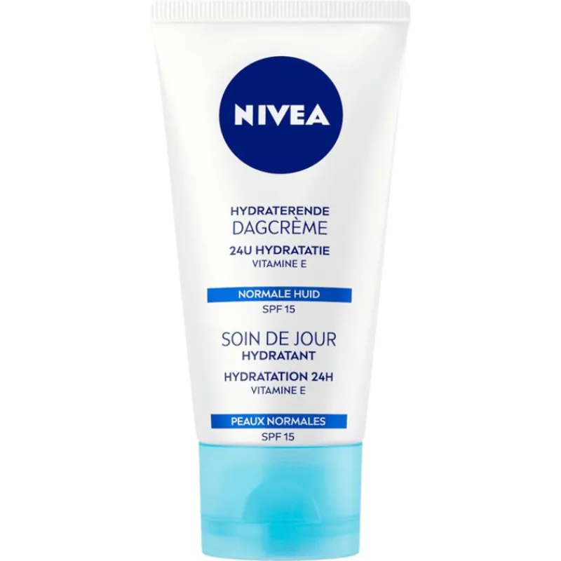 Bescherm en voed je huid dagelijks met NIVEA Hydraterende Dagcrème. Deze hydraterende crème is ontwikkeld voor de normale huid en helpt je huid om in evenwicht te komen. Geniet 24 uur lang van intensieve hydratatie en houd je vochtbalans op peil, waardoor je huid voller en steviger aanvoelt. Tegelijkertijd heeft de dagcrème een verfrissende werking. De toevoeging van SPF 15 zorgt voor dagelijkse bescherming tegen de zon. Zie en voel het verschil: de lichtgewicht crème smelt moeiteloos in de huid. Je huid is elke dag diep gehydrateerd, zacht en veerkrachtig. Dermatologisch goedgekeurd.De NIVEA Essentials Hydraterende Dagcrème put zijn kracht uit het NIVEA Moisture Care Complex, verrijkt met lotusextract voor intensieve hydratatie en versteviging. De toegevoegde vitamine E fungeert als een natuurlijke antioxidant, terwijl magnoliaextract de huid kalmeert en pigmentvlekken tegengaat. Dagelijks gebruik van deze crème zorgt voor een frisse, sterke huid en een stralende teint. • Verrijkt met lotusextract, magnoliaextract en vitamine E• Hydrateert de huid 24 uur lang• Beschermt tegen de zon dankzij SPF 15• Geschikt voor de normale huid• Laat de huid zachter, voller en veerkrachtiger aanvoelen
