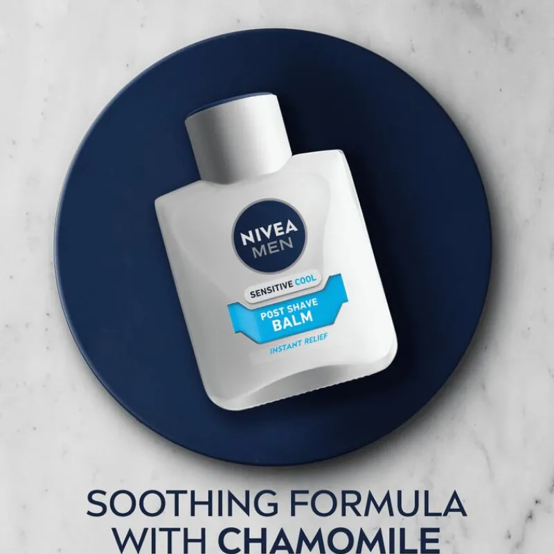 NIVEA MEN Sensitive Cooling Aftershave Balsem verzacht direct na het scheren. Deze aftershave verkoelt irritaties zonder een branderig gevoel achter te laten en biedt een langdurig mild en comfortabel gevoel op de huid. De alcoholvrije* formule met kamille en hydraterend zeewierextract brandt niet en verzacht de huid. Geen ontsierende roodheid en andere irritaties dus, en precies wat je zoekt voor een zelfverzekerd gevoel.