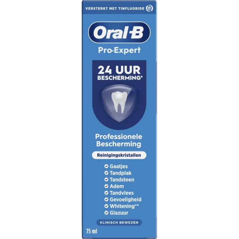 Oral-B Pro-Expert Professional Protection Reinigingskristallen Tandpasta is klinisch bewezen: het biedt 24 uur bescherming bij twee keer per dag gebruik, de antibacteriële technologie met tinfluoride-complex creëert een beschermmingsschild dat de groei van tandplak vermindert, zelfs tussen de poetsbeurten door. Een combinatie van fruitige en muntachtige noten verrijkt met een subtiele, kruidige smaak voor een voelbare frisheid