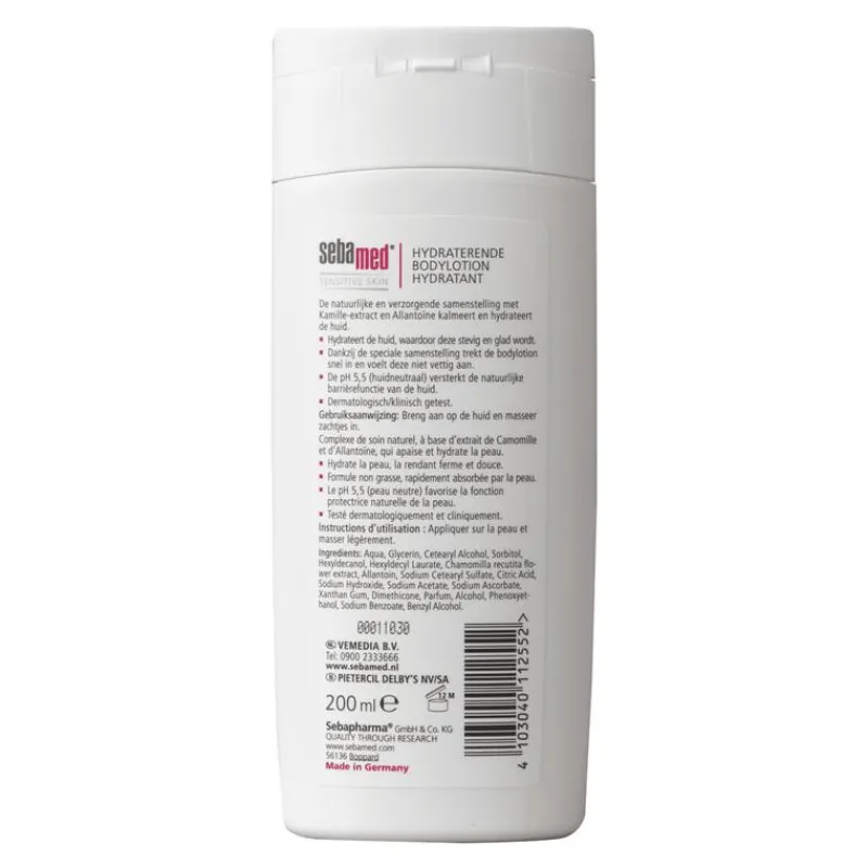 Sebamed Hydraterende Bodylotion is ideaal voor de dagelijkse verzorging van de huid. Water droogt de huid uit. Daarom is het extra belangrijk om je lichaam na een douche of bad in te smeren met bodylotion. De poriën staan dan open, waardoor de huid het product beter op kan nemen. De natuurlijke en verzorgende samenstelling met kamille-extract en allantoïne kalmeert en hydrateert de huid, waardoor deze stevig en glad wordt. Dankzij de speciale samenstelling trekt de bodylotion snel in. De huidneutrale pH-waarde van 5,5 versterkt de natuurlijke beschermingslaag van de huid. Zo blijft de huid gezond en in topconditie. Ontwikkelt door en met dermatologen. Dermatologisch/klinisch getest.