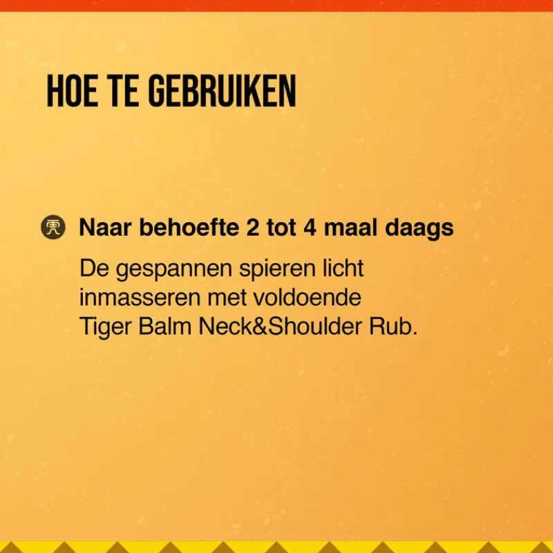 Gebruiksaanwijzing: Naar behoefte 2 tot 4 maal daags de gespannen spieren licht inmasseren met voldoende Tiger Balm Neck&Shoulder Rub. Uitsluitend voor uitwendig gebruik en op een intacte huid. Bij sommige huidtypen kan een allergische reactie ontstaan. Test het product altijd eerst op een klein stukje huid voordat je het gebruikt. Buiten bereik van kinderen bewaren. Niet gebruiken bij zwangerschap, borstvoeding en kinderen onder 12 jaar.