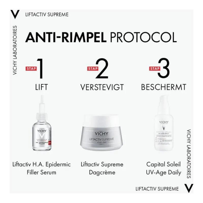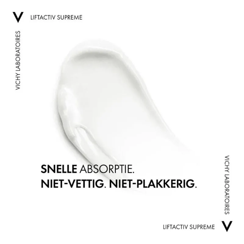 Langetermijnresultaat, maar vooral direct effect: nu, vanavond, morgenochtend na het ontwaken. Vichy’s nieuwe generatie in dagverzorging is er speciaal op gericht om dagelijkse huidveroudering in een handomdraai terug te draaien. De textuur smelt als het ware in de huid. Liftactiv Supreme’s formule dringt snel door in de huidlagen waarbij het een fris, comfortabel gevoel achterlaat. Het is hiernaast een ideaal product om te gebruiken onder zonnebrandcrème of make-up. Er is voor een geur gekozen die het risico op allergie zoveel mogelijk minimaliseert.