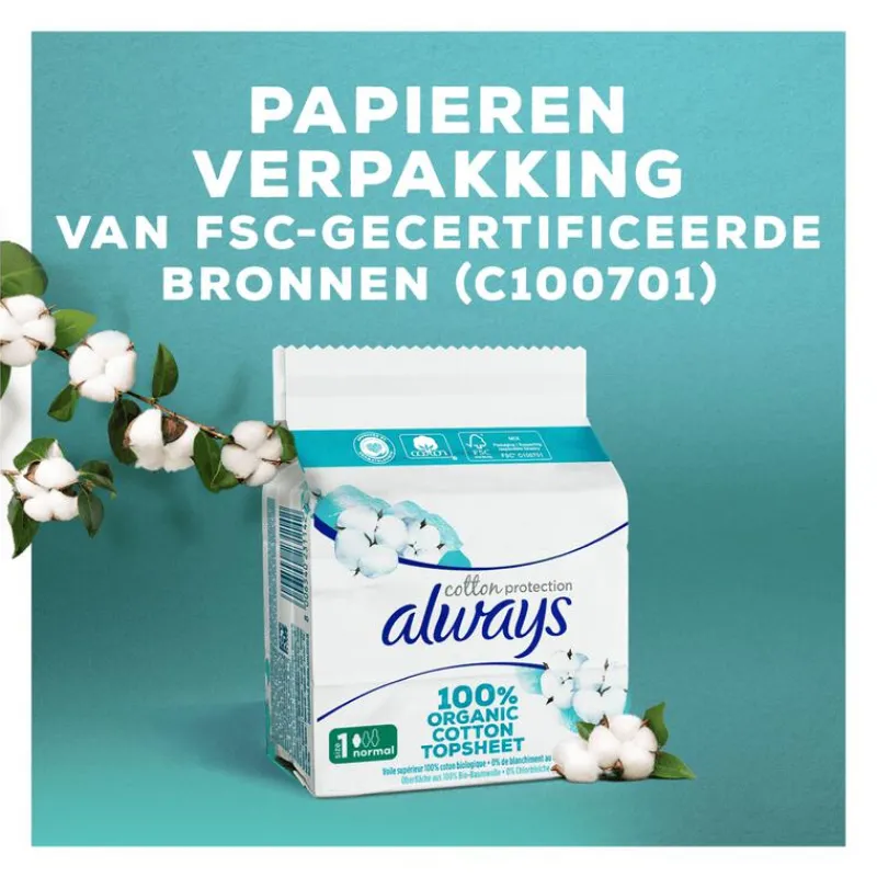 Always Always Cotton Protection maandverband zorgt voor jou en het milieu met een toplaag van 100% biologisch katoen in een recyclebare papieren verpakking.