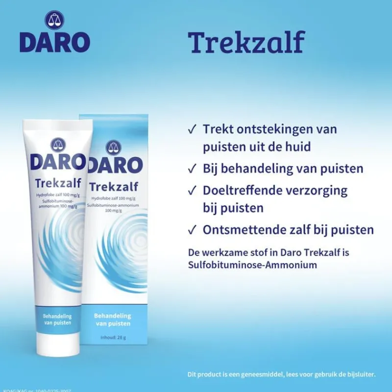 Het is een doeltreffende zalf bij puisten met ontstekende werking. De werkzame stof in Daro Trekzalf is Bulfobituminose-Ammonium, dit maakt de hoornlaag van de huid zacht, waardoor een ontsteking letterlijk uit de huid ‘getrokken’ wordt.