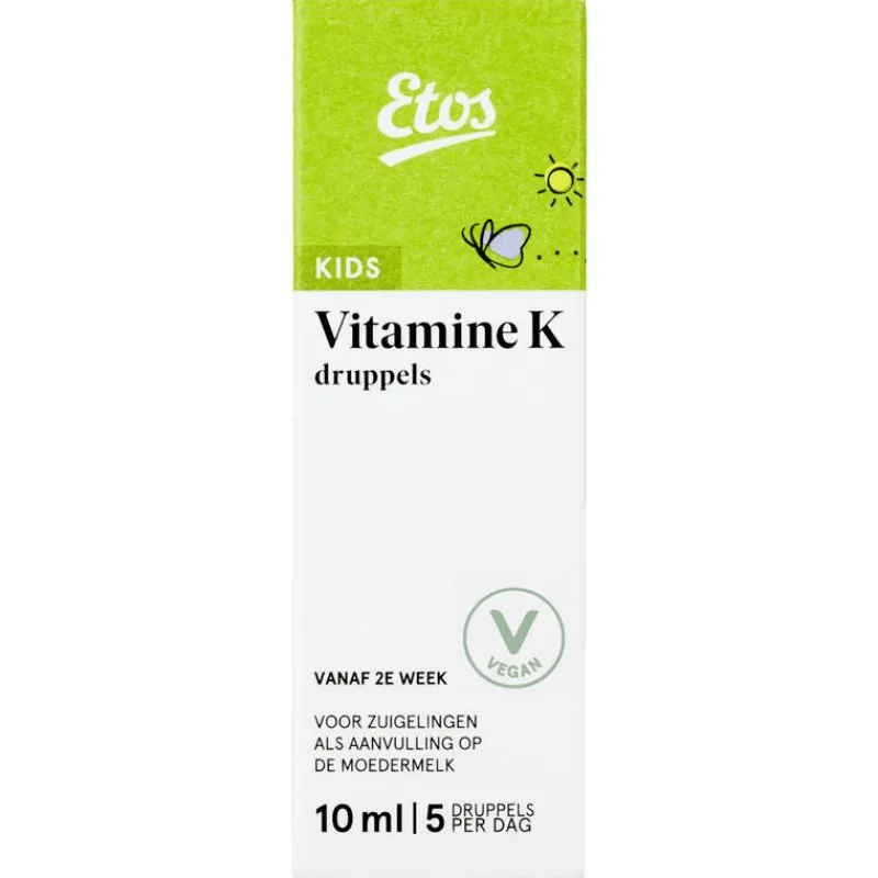 Etos Kids Vitamine K Druppels met Vitamine K draagt bij tot de normale bloedstolling. In moedermelk zit onvoldoende vitamine K. Baby’s die borstvoeding krijgen hebben de eerste drie maanden extra vitamine K nodig.