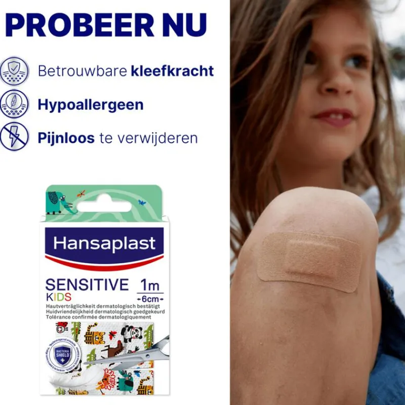 Hansaplast Sensitive Kids pleisters zijn zeer huidvriendelijk en geschikt voor het bedekken van alle soorten kleinere wondjes. Het comfortabele materiaal is hypoallergeen en flexibel. Het niet-plakkende wondkussen beschermt en verzacht de wond. De veilige en huidvriendelijke kleeflaag zorgt ervoor dat de pleister goed blijft zitten en toch pijnloos te verwijderen is. De pleisters zijn verkrijgbaar- als stroken in verschillende maten die rondom de wond afdichten en- als verbandlengte die op de ideale maat kan worden geknipt. Hansaplast Sensitive pleisters zijn geschikt voor de gevoelige huid. Zacht en ademend materiaal.