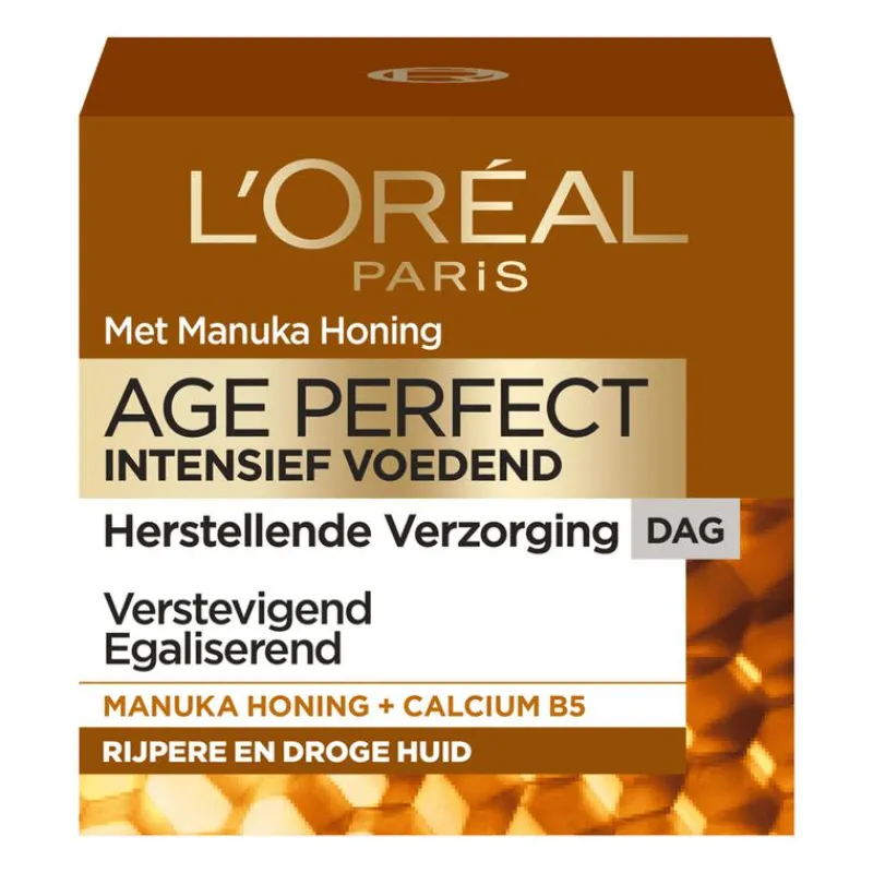 Ontdek nu de vernieuwde dagcrème van Age Perfect Intensief Voedend met Manuka Honing. Manuka honing, oorspronkelijk afkomstig uit Nieuw-Zeeland, staat in de medische wereld bekend als een krachtig, onbewerkt ingrediënt. De essentiële voedingstoffen en mineralen zijn opgenomen in deze intens voedende dagcrème. De crème ondersteunt het natuurlijke herstel van de huidbarrière functie. De rijke, herstellende formule is speciaal ontwikkeld voor de droge tot zeer droge huid.