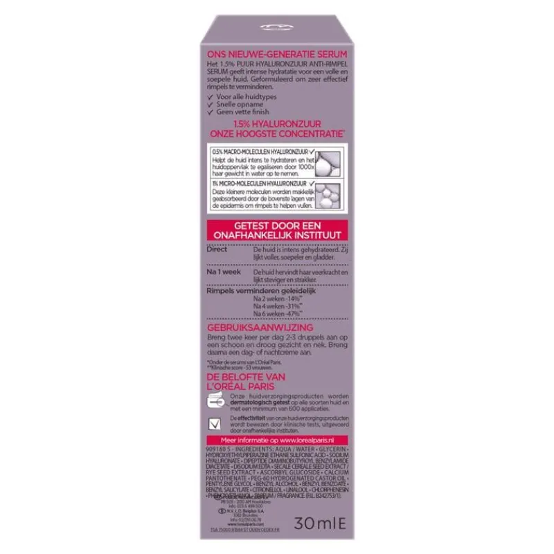 L’Oréal Paris Revitalift Hyaluronzuur Filler Serum – Anti Rimpel Gezichtsverzorging – 30 ml Een gezichtsserum voor een intense hydratatie en een soepelere en gladdere huid Productbeschrijving Revitalift Hyaluronzuur Filler serum van L’Oréal Paris hydrateert en geeft de huid veerkracht. Met 1,5% Hyaluronzuur heeft dit serum de hoogste concentratie hyaluronzuur van alle L’Oréal Paris serums en is daardoor een ware boost voor je huid. Verbetert aanzienlijk de veerkracht en stevigheid van de huid Helpt zichtbaar bij het verminderen van rimpels Een ware boost voor de huid Geschikt voor alle huidtypes Met een extra hoge concentratie hyaluronzuur van 1,5% Met de handige pipet kan de hoeveelheid serum precies naar wens gedoseerd worden Hyaluronzuur is een krachtige hydrator. Het beschermt de huid, laat het er voller uitzien en vermindert de zichtbaarheid van fijne lijntjes en rimpels. Hyaluronzuur is een lichaamseigen stof, die de vochthuishouding in de huid ondersteunt. Verrijkt met 0,5% macro-hyaluronzuur moleculen om de huid te hydrateren en 1% micro-hyaluronzuur moleculen om rimpels aanzienlijk op te vullen waardoor de huid steviger en strakker oogt. Naast hydratatie speelt hyaluronzuur ook een belangrijke rol bij wondheling en huidherstel. Het resultaat Direct: De huid is intens gehydrateerd, lijkt zichtbaar voller, soepeler en gladder Na een week: De veerkracht van de huid lijkt aanzienlijk vernieuwd, oogt steviger en strakker