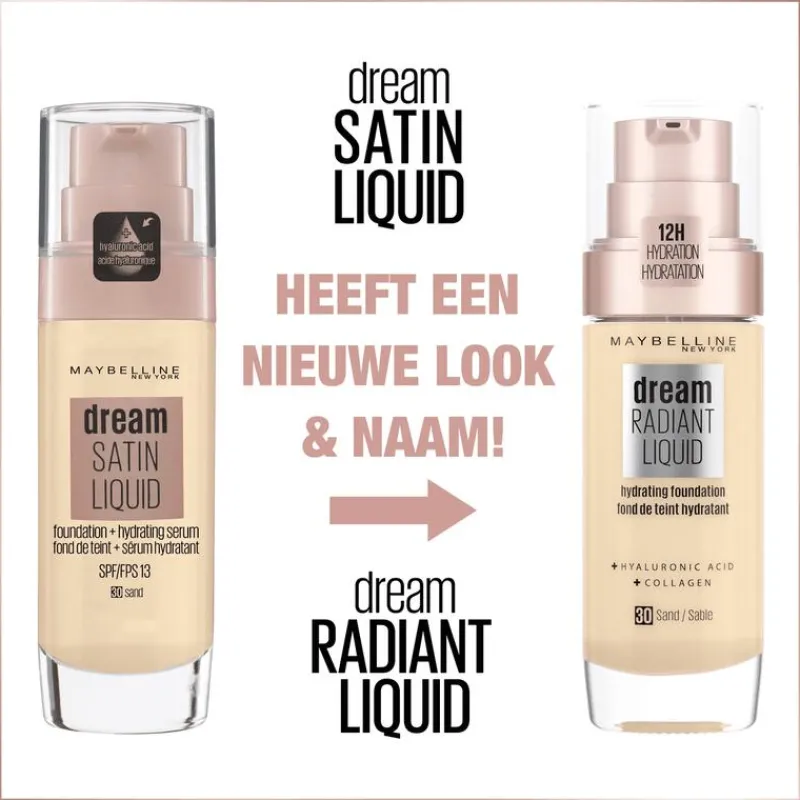 Maybelline New York Dream Radiant Liquid 21 Nude Beige is een foundation met verzorgend collageen en hyaluronzuur voor een egaal uitziende teint Voor een stralende huid + tot 12H hydratatie.