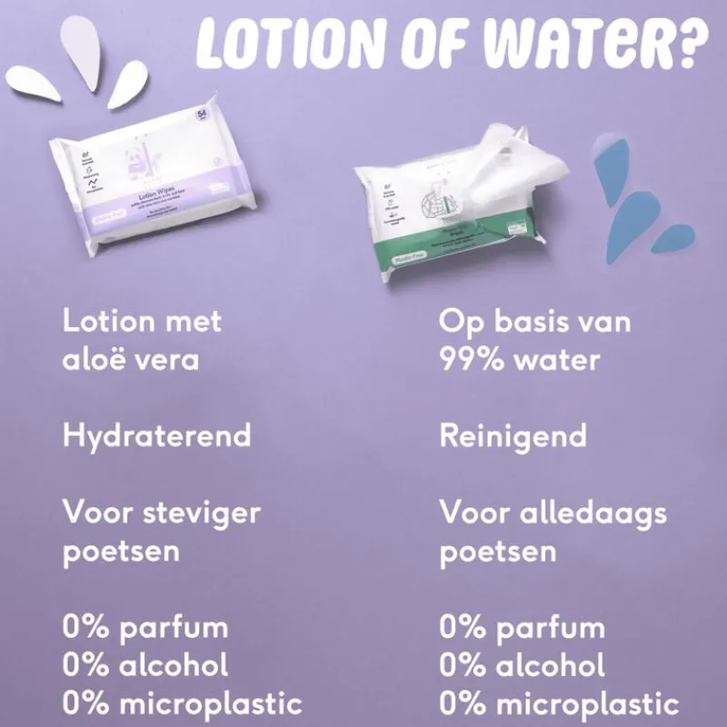 Om de gevoelige babyhuid zo goed mogelijk te verzorgen bestaan de plasticvrije doekjes voor 99% uit water, zonder alcohol, parfum of microplastics. Ze zijn dermatologisch getest en te gebruiken voor alle leeftijden (ook direct na de geboorte). De babydoekjes zijn daarnaast stevig, niet te nat én niet te droog en kunnen zelfs de meest vieze luiers, plakvingers en speelgoed aan. Veilig te gebruiken voor billen, lichaam en gezicht.