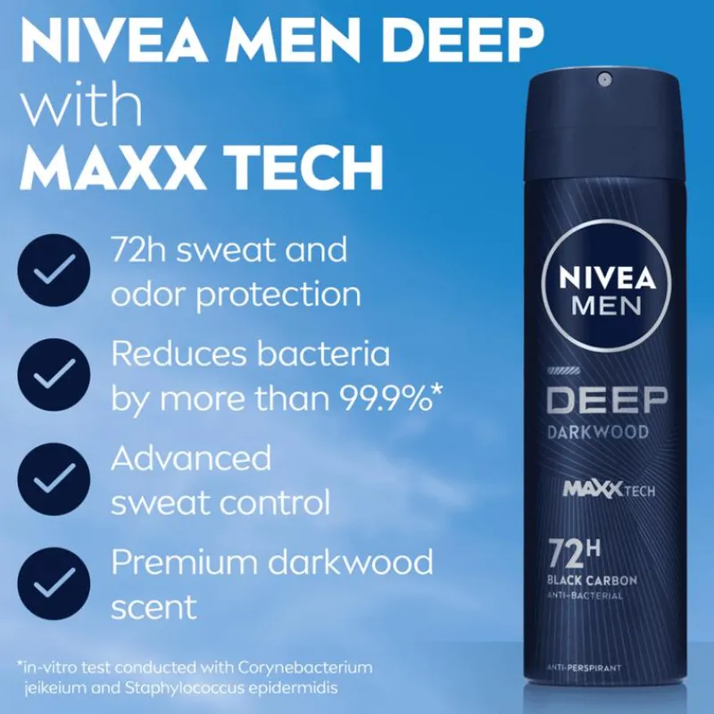 NIVEA MEN DEEP Darkwood Black Carbon Anti-Transpirant is speciaal ontwikkeld voor mannen die op zoek zijn naar een krachtige en betrouwbare bescherming tegen transpiratie. Deze deodorant biedt maar liefst 72 uur lang effectieve anti-transpirantbescherming, waardoor je de hele dag verzekerd bent van een fris en zelfverzekerd gevoel. De unieke formule is verrijkt met zwart koolstof, wat niet alleen zorgt voor een krachtige bescherming tegen bacteriën, maar ook een langdurige, mannelijke geur van donkere houtsoorten biedt.Deze deodorant voor mannen is ontworpen om geen zichtbare zwarte resten achter te laten, zodat je huid droog en schoon aanvoelt zonder ongewenste sporen op je kleding. Of je nu een drukke werkdag hebt, intensief sport of ontspant tijdens je vrije tijd, NIVEA MEN DEEP zorgt ervoor dat je altijd fris en verzorgd blijft. Bovendien is de huidverdraagzaamheid dermatologisch bewezen, zodat je deze deo met een gerust hart dagelijks kunt gebruiken. Kies voor NIVEA MEN DEEP Darkwood Black Carbon Anti-Transpirant en ervaar krachtige bescherming, langdurige frisheid en ultiem comfort in één.