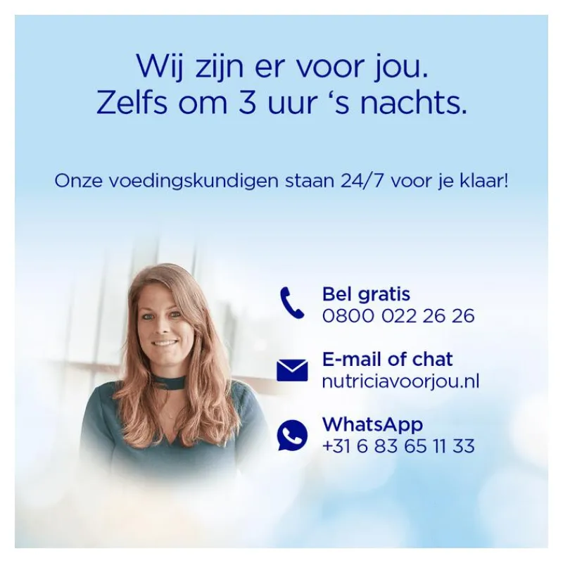 – Heb je vragen over de voeding van je kindje? Onze voedingskundigen staan 24/7 voor je klaar. Bel de Nutricia Kindervoeding Service op: 0800 022 26 26.