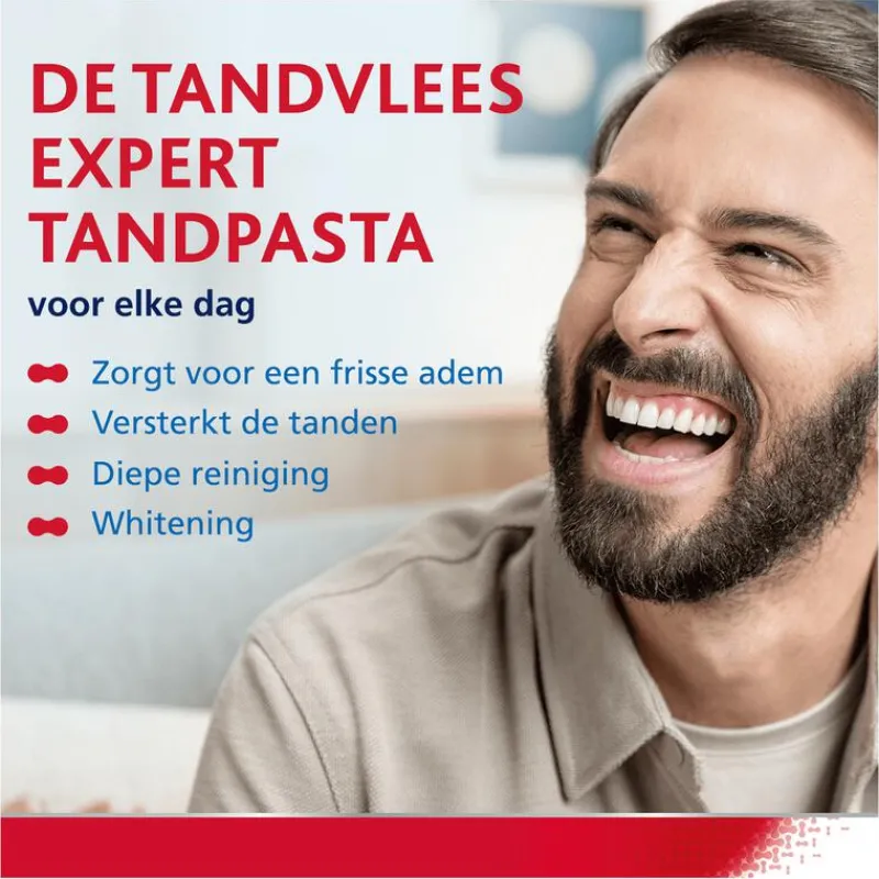 parodontax Complete Protection Whitening tandpasta heeft 8 voordelen voor gezond tandvlees&sterke tanden. En gaat daarmee verder waar een gewone tandpasta stopt. Deze tandpasta is 4x effectiever in het verwijderen van tandplak* en helpt jou daarbij met het volgende: Gezond tandvlees, voorkomt slechte adem, houdt de aansluiting tussen tanden en tandvlees in stand. Daarnaast zorgt Complete Protection tandpasta voor een diepe reiniging tussen de tanden en maakt schoon voor een fris gevoel. parodontax Complete Protection tandpasta zorgt met fluoride voor sterker tandglazuur. Met Whiting effect. Bij 2x daags poetsen.