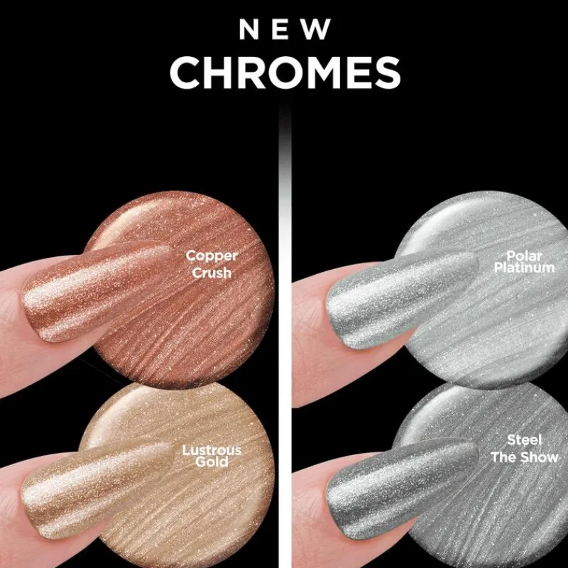 We presenteren 4 soorten Sally Hansen Insta-Dri nagellak met chroom in een reeks prachtige kleuren. Metallic tinten om 4 vurige chroomlooks mee te creëren.