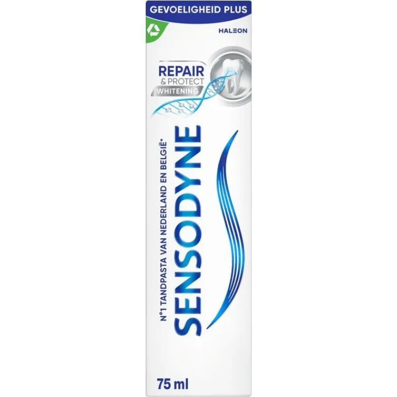 Sensodyne Repair & Protect Deep Repair Whitening dagelijkse tandpasta helpt de kwetsbare plekken van de tand te herstellen en te beschermen. Het is klinisch bewezen dat de unieke NovaMin formule van de tandpasta verlichting geeft bij pijnlijke gevoeligheid. Sensodyne Repair & Protect Deep Repair Whitening dagelijkse tandpasta bevat fluoride om de tanden te helpen versterken. De vernieuwde Sensodyne Repair & Protect Deep Repair Whitening dagelijkse tandpasta vormt een harde laag op de kwetsbare plekken van de gevoelige tanden om te helpen bij herstel. Daarnaast helpt Sensodyne Repair & Protect Deep Repair Whitening tandpasta de natuurlijke witheid van je tanden te herstellen.