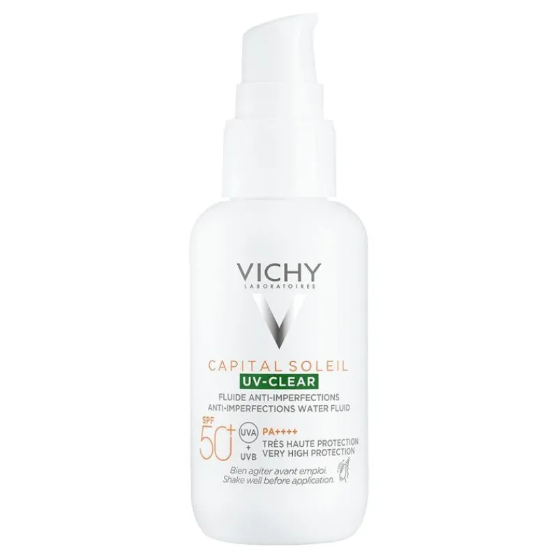Vichy Capital Soleil UV Clear SPF 50+ is een ultralichte fluïde met zeer hoge bescherming (SPF 50+) die onzuiverheden en het vette uiterlijk van de huid voorkomt en vermindert, zonder sporen achter te laten.