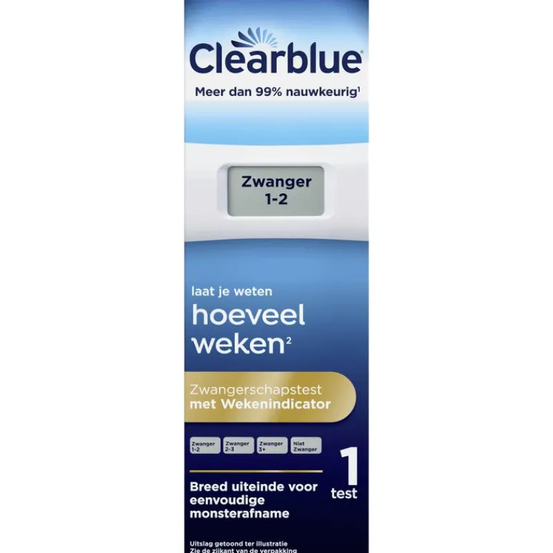 Lees altijd eerst de bijsluiter van uw medicijnen voordat u een test uitvoert. Een onterechte positieve uitslag kan worden veroorzaakt door medicatie die hCG bevat en door bepaalde zeldzame medische aandoeningen. Een buitenbaarmoederlijke of recente zwangerschap (zelfs als de zwangerschap niet is voldragen) kan misleidende uitslagen opleveren. Als u (bijna) in de menopauze bent, kan u ook een onterechte uitslag Zwanger krijgen terwijl u niet zwanger bent. De test zou NIET moeten worden beïnvloed door hormoonbehandelingen met clomifeencitraat, reguliere pijnstillers, alcohol, antibiotica of de anticonceptiepil. Als u een onverwachte uitslag krijgt, dient u deze te bespreken met uw huisarts. Bij meerlingzwangerschappen en buitenbaarmoederlijke zwangerschappen kan de wekenindicator een verkeerde uitslag geven.Dit digitale IVD-apparaat voldoet aan de vereisten voor emissie en immuniteit van EN 61326-2-6. De EMC-tegenmaatregelen die in dit elektronische instrument zijn gebruikt, geven een redelijke bescherming tegen de effecten van elektromagnetische interferentie die vaak in de thuisomgeving voorkomt. De volgende preventieve waarschuwingen zijn van toepassing op apparatuur die voldoet aan EN 61326-2-6. a) Gebruik van dit instrument in een droge omgeving, vooral als er synthetische materialen aanwezig zijn (synthetische kleding, tapijten enz.) kan schadelijke statische ontladingen veroorzaken die foutieve uitslagen kunnen veroorzaken. b) Gebruik dit instrument niet in de nabijheid van bronnen van sterke elektromagnetische straling (bijv. mobiele telefoons), omdat deze de juiste werking kunnen verstoren.*Laat u weten hoeveel weken (Clearblue digitale zwangerschapstest met wekenindicator): het aantal weken na bevruchting wordt afgebeeld als 1-2, 2-3 of 3+. *Net als 2 testen in 1 (Clearblue digitale zwangerschapstest met wekenindicator): vertelt u of u zwanger bent en hoe ver u bent. *Het meest verkochte merk van zwangerschaps- en vruchtbaarheidstesten voor thuisgebruik ter wereld. Gebaseerd op internationale verkoopcijfers in bijna 20 landen, verzameld met behulp van onafhankelijke marktonderzoeksgegevens. *Meer dan 99% nauwkeurig: meer dan 99% nauwkeurig bij het detecteren van zwangerschap vanaf de dag dat uw menstruatie zou moeten beginnen (Clearblue zwangerschapstesten). Meer dan 99% nauwkeurig bij het detecteren van de LH-piek (Clearblue ovulatietesten). 99% nauwkeurig bij het detecteren van de LH-piek (Clearblue geavanceerde vruchtbaarheidsmonitor). *Clearblue is veruit het nauwkeurigst: meer dan 99% nauwkeurig bij het detecteren van zwangerschap vanaf de dag dat uw menstruatie zou moeten beginnen (Clearblue zwangerschapstesten). Meer dan 99% nauwkeurig in het detecteren van de LH-toename (Clearblue ovulatietesten). *Net zo nauwkeurig als een echo om te zien hoelang u zwanger bent (Clearblue digitale zwangerschapstest met wekenindicator): weken komt in 97% overeen met de uitslag van latere echo-onderzoeken. Dit is op basis van een onderzoek onder 187 vrouwen waarbij het aantal weken werd vergeleken met een echo-onderzoek. *Snelle uitslag na 1 minuut (Clearblue zwangerschapstest met snelle detectie en Clearblue Flip & Click zwangerschapstest): de uitslag Zwanger kan vanaf de dag van de gemiste menstruatie al na 1 minuut verschijnen. Wacht 3 minuten om de uitslag Niet Zwanger te bevestigen. *Uitslagen 6 dagen voor uw gemiste menstruatie (Clearblue ultravroege zwangerschapstest): 79% van de uitslag Zwanger kan 6 dagen voor uw gemiste menstruatie worden gedetecteerd. *Uitslagen 6 dagen voor uw gemiste menstruatie (Clearblue digitale ultravroege zwangerschapstest): 78% van de uitslag Zwanger kan 6 dagen voor uw gemiste menstruatie worden gedetecteerd. *Uitslagen 6 dagen voor uw gemiste menstruatie (Clearblueultravroege GEAVANCEERDE zwangerschapstest): 77%van de uitslag Zwanger kan 6 dagen voor uw gemiste menstruatie worden gedetecteerd. *Uitslagen 5 dagen voor uw gemiste menstruatie (Clearblue digitale zwangerschapstest met