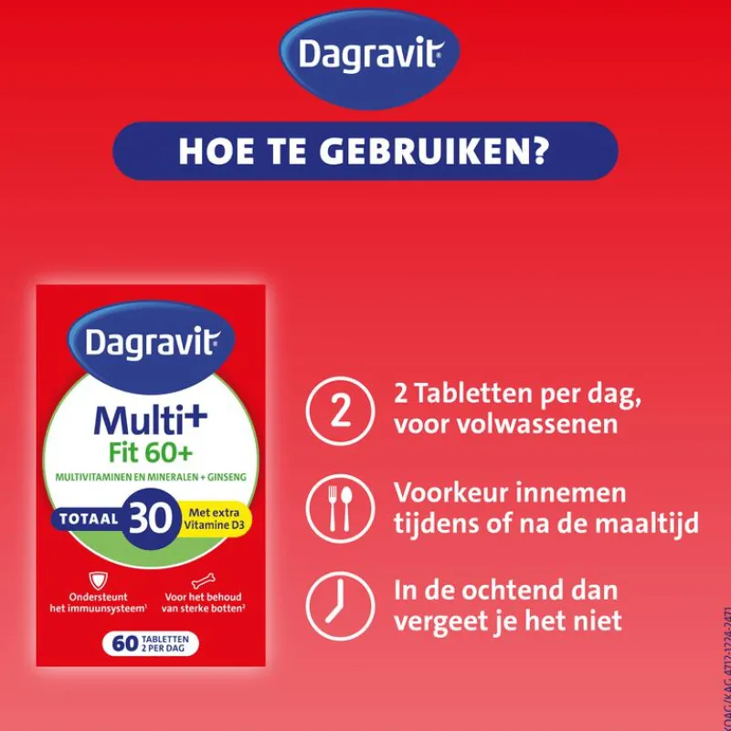 Gebruiksaanwijzing en aanbevolen gebruik per dag: Volwassenen: 2 tabletten per dag. Bij voorkeur innemen tijdens of na de maaltijd met water. In verband met de grootte van de tabletten mogen deze gebroken en/of verpulverd worden bij inname. De aanbevolen dagelijkse dosering niet overschrijden. Dit voedingssupplement is niet geschikt voor kinderen onder de 18 jaar. Raadpleeg je arts bij gelijktijdig gebruik van antistollingsmiddelen.Dagravit Totaal 30 Vitaal 60+ Multivitaminen bevat geen conserveermiddelen, geen geur- en smaakstoffen en is lactose vrij.