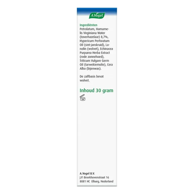 Ingrediënten: Petrolatum, Hamamelis Virginiana Water (toverhazelaar) 8,7%, Hypericum Perforatum Oil (sint-janskruid), Lanolin (wolvet), Echinacea Purpurea Herba Extract (rode zonnehoed), Triticum Vulgare Germ Oil (tarwekiemolie), Cera Alba (bijenwas). De zalfbasis bevat wolvet.