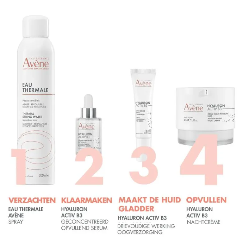 AVENE THERMAL SPRING WATER (AVENE AQUA). CAPRYLIC/CAPRIC TRIGLYCERIDE. GLYCERIN. SQUALANE. BUTYROSPERMUM PARKII (SHEA) BUTTER (BUTYROSPERMUM PARKII BUTTER). CARTHAMUS TINCTORIUS (SAFFLOWER) SEED OIL (CARTHAMUS TINCTORIUS SEED OIL). PENTAERYTHRITYL TETRACAPRYLATE/TETRACAPRATE. CETEARYL ALCOHOL. BEHENYL ALCOHOL. NIACINAMIDE. C20-22 ALKYL PHOSPHATE. C20-22 ALCOHOLS. RETINAL. SODIUM HYALURONATE. TERMINALIA CHEBULA FRUIT EXTRACT. ADENOSINE. ACACIA SENEGAL GUM. CETEARYL GLUCOSIDE. FRAGRANCE (PARFUM). HELIANTHUS ANNUUS (SUNFLOWER) SEED OIL (HELIANTHUS ANNUUS SEED OIL). RED 33 (CI 17200). SODIUM BENZOATE. SODIUM HYDROXIDE. TOCOPHEROL. TOCOPHERYL GLUCOSIDE. WATER (AQUA). XANTHAN GUM