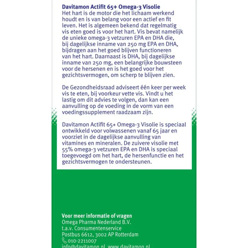 Davitamon Actifit 65+ Omega-3 Visolie is speciaal ontwikkeld voor volwassenen vanaf 65 jaar en voorziet in de dagelijkse aanvulling van vitamines en mineralen. Davitamon Actifit 65+ Omega-3 is: