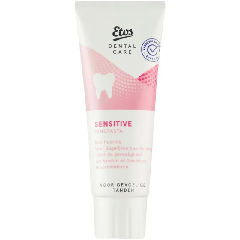 Etos Sensitive tandpasta 75 ml beschermt de gevoelige tanden en verbetert de conditie van het tandvlees. Daarnaast verwijdert de tandpasta tandplak bij tweemaal daags twee minuten poetsen en bevat de tandpasta fluoride dat op milde wijze helpt beschermen tegen cariës.