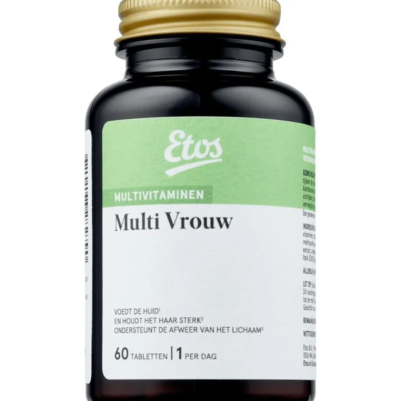 Etos Multi Vrouw tabletten zijn speciaal ontwikkeld voor vrouwen. Etos Multi Vrouw tabletten dragen bij aan een gevoede huid en sterk haar en de afweer van het lichaam wordt ondersteund.