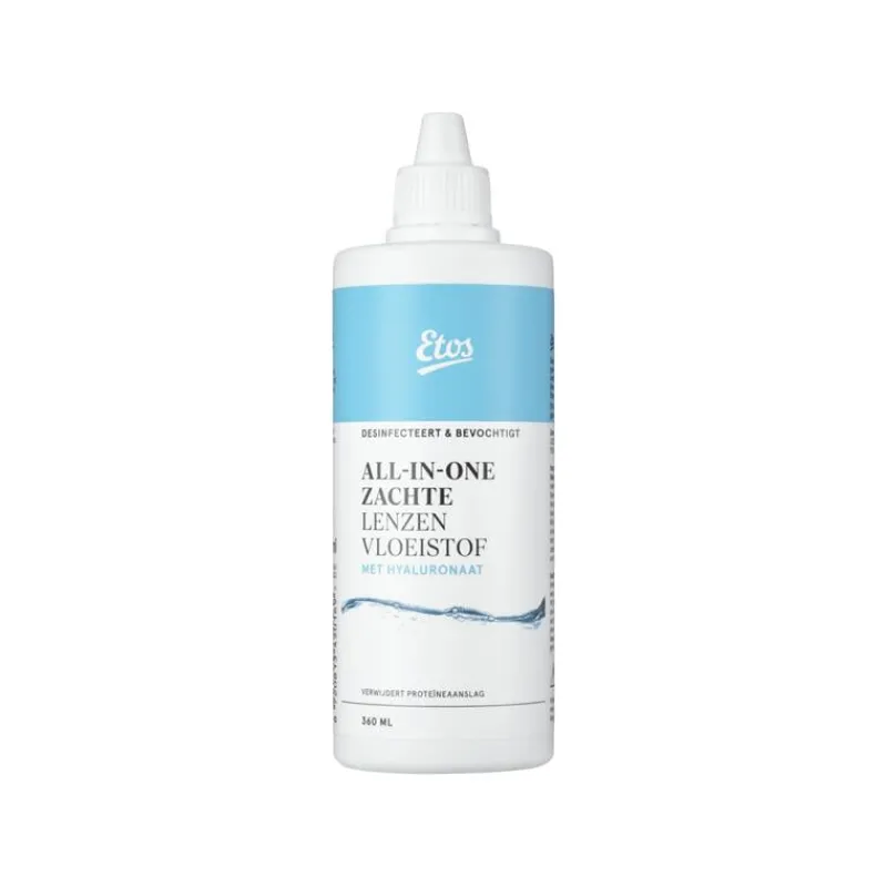 Etos All-in-one zachte lenzen vloeistof met hyaluronaat is geschikt voor gevoelige ogen en speciaal ontwikkeld voor zachte contactlenzen. De unieke formule reinigt, desinfecteert en bevochtigt de ogen en verwijdert proteïneaanslag. Met Etos all-in-one vloeistof onderhoud je zorgvuldig je lenzen.