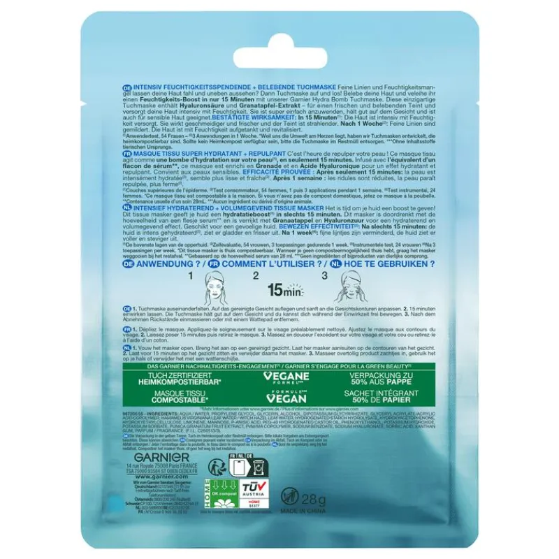 De tissue, bestaande uit 100% vezels van natuurlijke oorsprong, werkt als een hydraterend kompres. De frisheid van het masker kalmeert meteen de huid en zorgt voor een echt feel good-moment.- Geschikt voor ieder huidtype, zelfs de gevoelige huid- Geschikt voor de gevoelige en droge huid- Verrijkt met granaatappelextract en hyaluronzuur- Geeft de huid een boost in 15 minuten