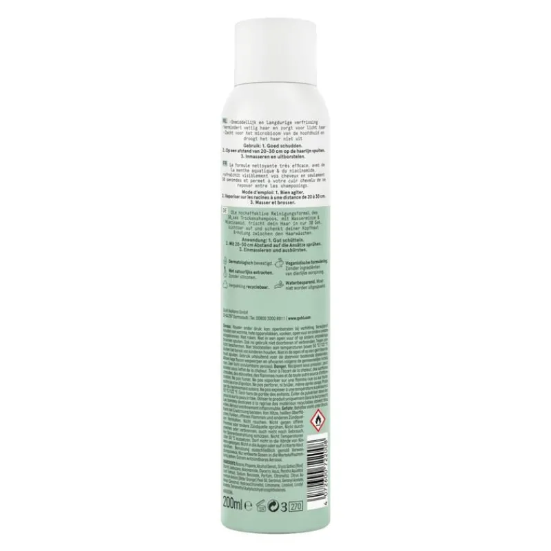 De Guhl 30 sec. Pure Frisheid Droogshampoo bevat een uiterst effectieve reinigingsformule met watermunt en niacinamide. De droogshampoo verfrist je haar zichtbaar in slechts 30 seconden en geeft je hoofdhuid rust tussen de wasbeurten door.