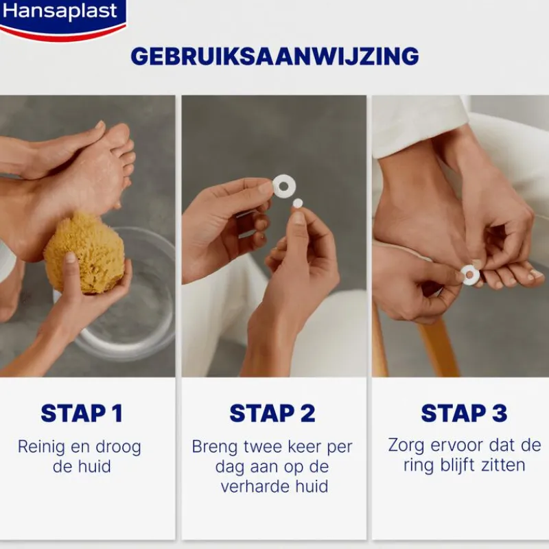 Aanbrengen op een schone en droge huid. Plak de ring zo, dat de likdoorn zich precies in het midden van de ring bevindt. Druk de ring stevig aan.
