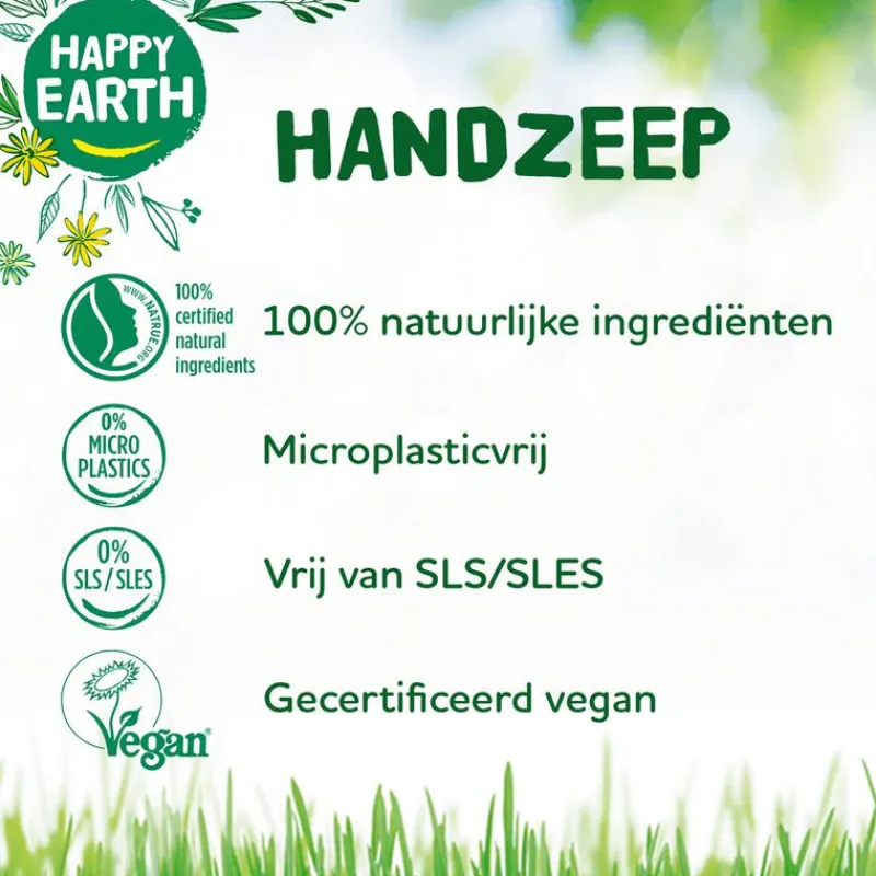 HAPPY EARTH HAND SOAP is de puurste handzeep ter wereld: 100% natuurlijk, 100% effectief en bevat 0% chemicaliën.