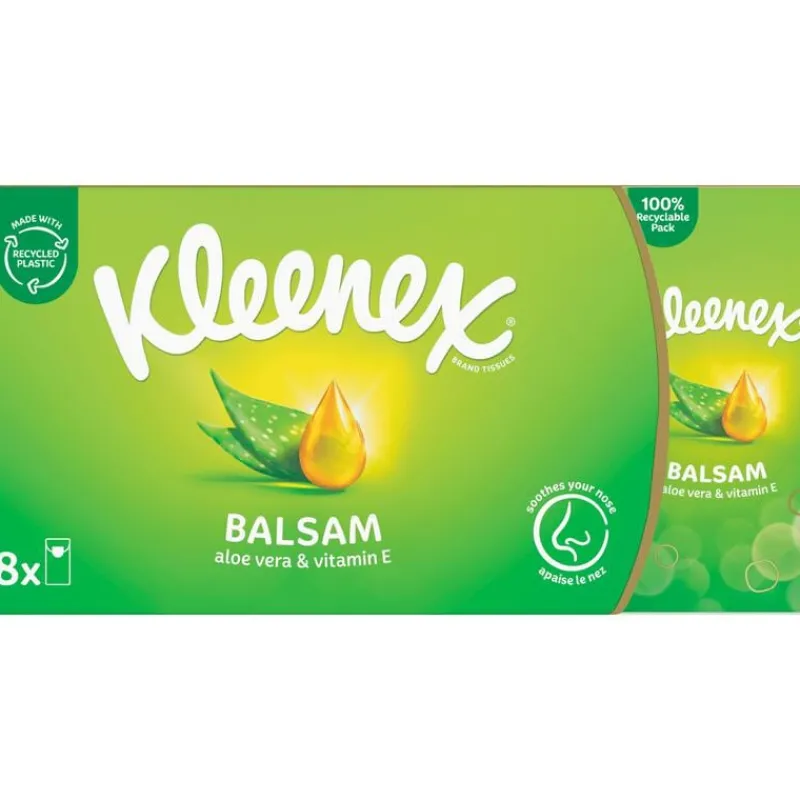 Kleenex Balsam zakdoekjes bevatten een laagje verzachtende calendulabalsam. Dat voorkomt een rode, schrale neus bij verkoudheid en griep. Ook verkrijgbaar als tissues.