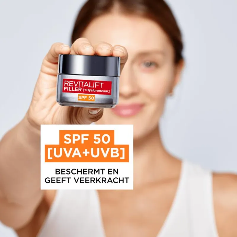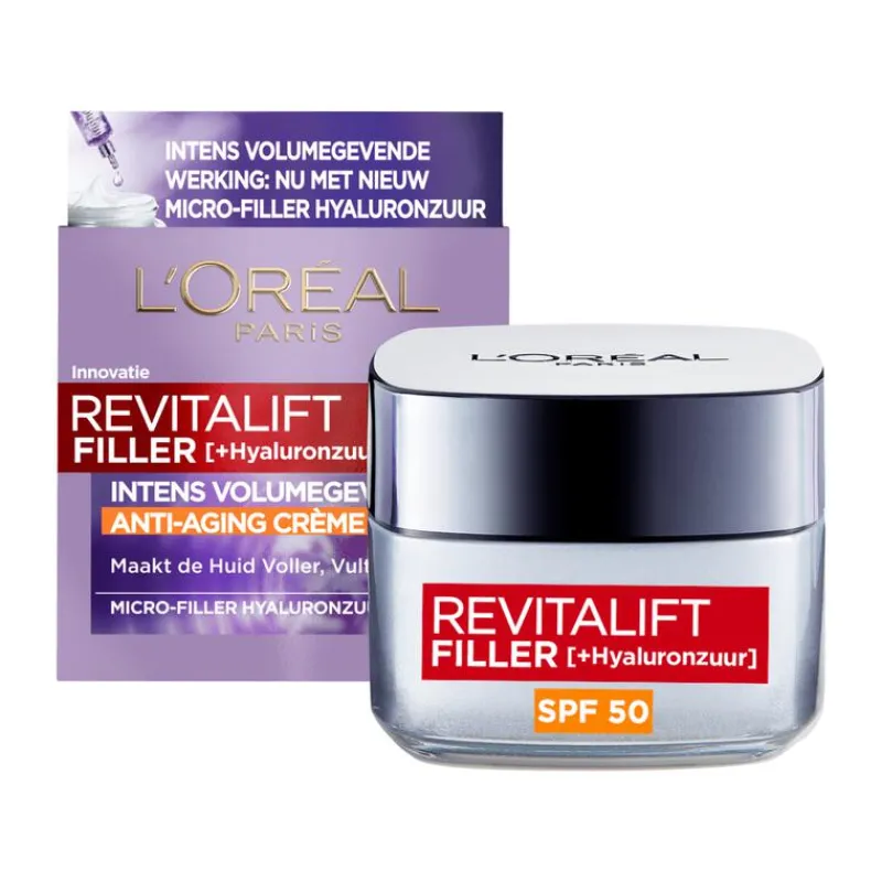 De nieuwe Revitalift Filler dagcrème met SPF50 vult rimpels en maakt de huid voller. Deze lichte formule beschermt de huid tegen UVB en UVA-straling, om zo de tekenen van huidveroudering door de zon te helpen tegengaan. Hyaluronzuur is een huideigen, vochtvasthoudend bestanddeel wat afneemt naarmate je ouder wordt. Voor deze dagcrème heeft L’Oréal Paris de nieuwste generatie hyaluronzuur geselecteerd: Micro-Hyaluronzuur. Het Micro-Filler Hyaluronzuur in deze dagcrème is 50X kleiner dan Macro Hyaluronzuur voor een intens volumegevende werking. Het helpt rimpels te vullen en geeft de huid volume. De drie hyaluronzuur variaties in deze dagcrème zijn van natuurlijke oorsprong en vervaardigd met Franse biotechnologie. Daarnaast bevat Revitalift Filler dagcrème Fibroxyl, een plantaardig extract dat de huid opbouwend meer volume geeft. Dit product is geschikt voor vrouwen vanaf 35 jaar.