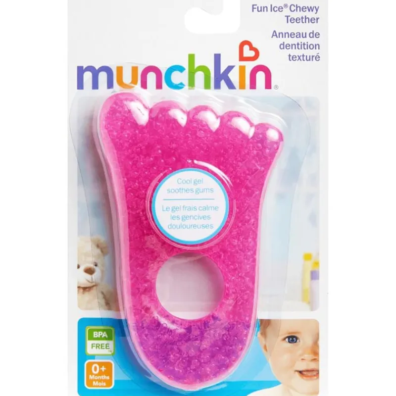 Munchkin Fun Ice Chewy Teether Foot Bijtring om pijn bij het tandjes krijgen te helpen verlichten. Met de grappige vorm, felle kleur en onweerstaanbare textuur van dit leuk-om-op-te-kauwen bijtspeeltje helpt je je baby alle tandjesellende te doorstaan. Stop het in de koelkast om de gel af te koelen. Makkelijk vast te houden voor kleine handjes en met allerlei getextureerde nopjes en oppervlakken die dat pijnlijke tandvlees helpen te masseren. In een mum van tijd lacht je baby weer.